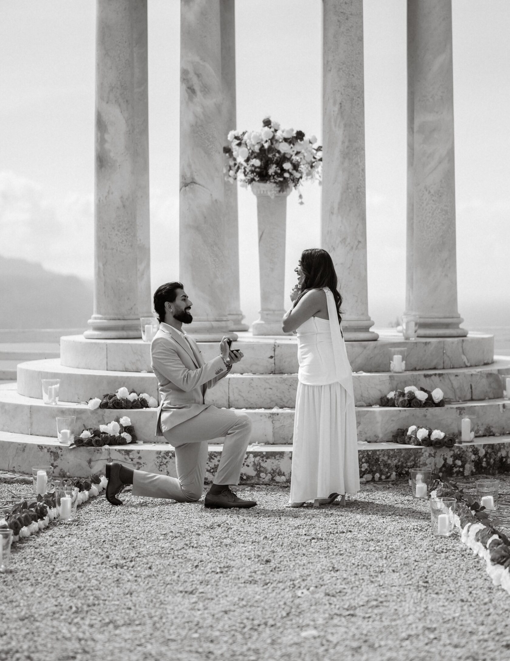 Mallorca gave these two the kind of backdrop you can feel—sea air, cypress trees, and the marble temple at Son Marroig set against the Tramuntana coast . After a quiet walk through the gardens, Taran led Jasmine toward the rotunda, where the view opens to the cliffs and the Mediterranean, and dropped to one knee as the breeze lifted her dress and everything slowed down . The yes was instant, the laughter louder, and the moment stayed private and effortless—the kind of surprise that’s planned in the background and lived fully in the foreground .
